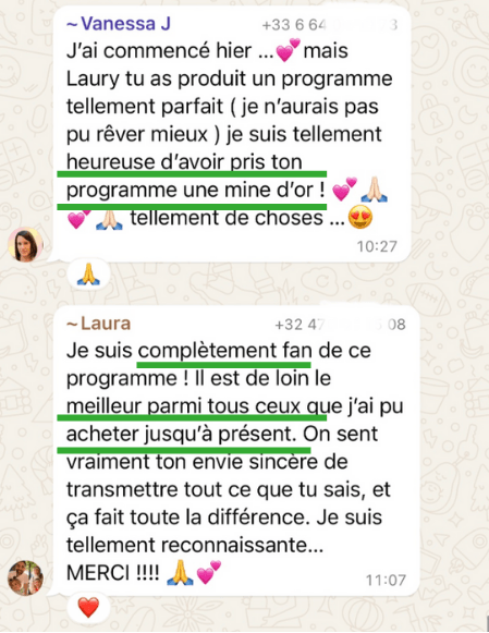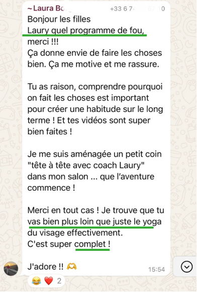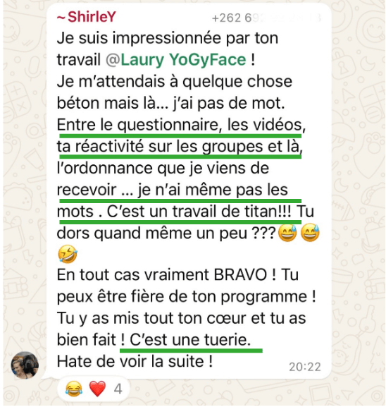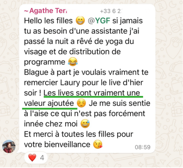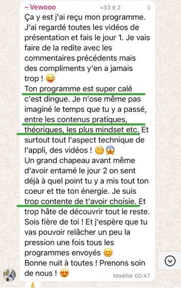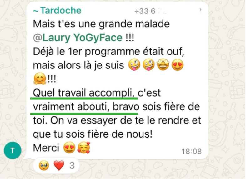 Les routines que tu suis sont suffisamment détaillées et claires pour que tu puisses progresser en toute autonomie, mais si tu as le moindre doute ou besoin de conseils supplémentaires, tu pourras me solliciter à tout moment via le groupe privé et lors des 2 lives par mois spéciales questions pratiques.